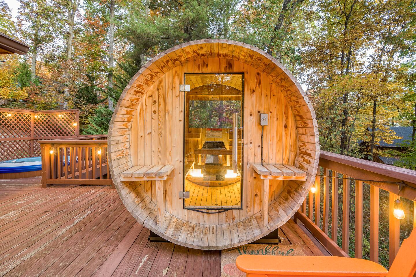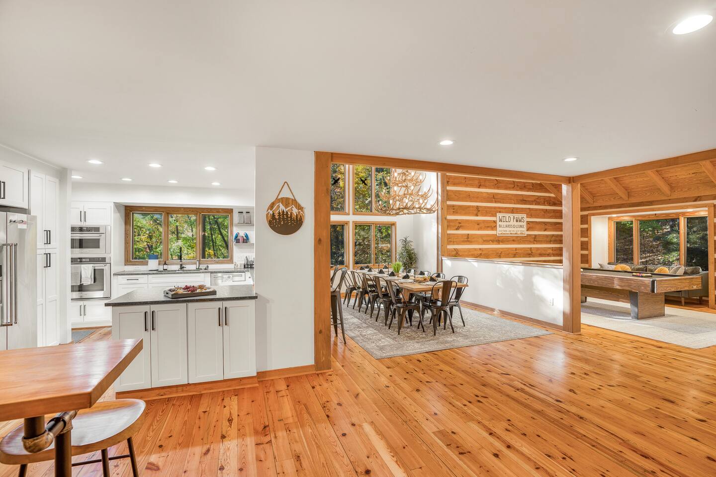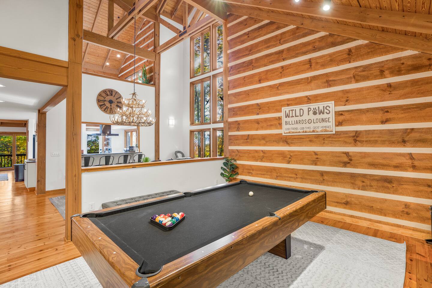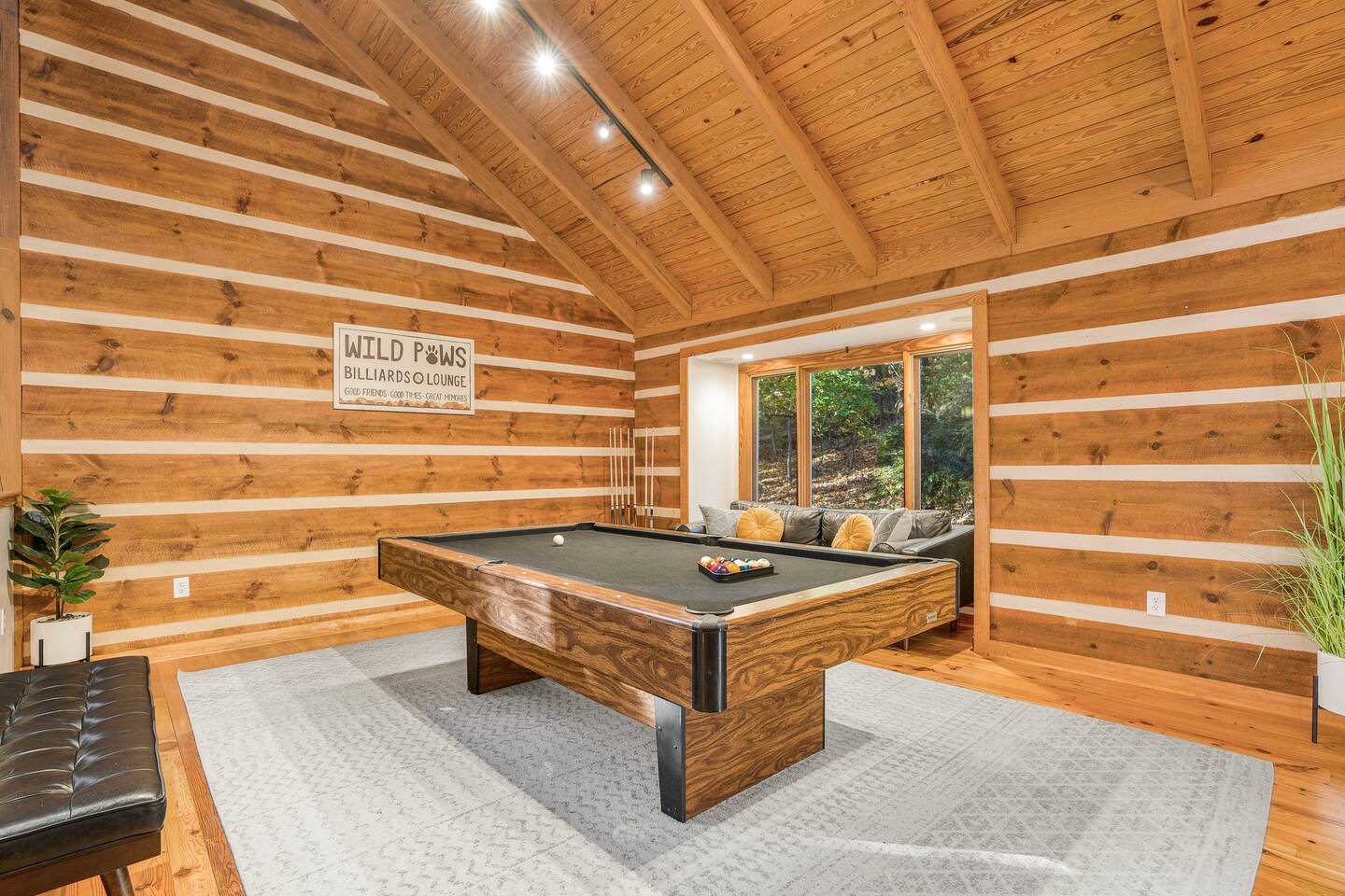 Welcome to Wild Paws Haven, a 5,500+ sq ft modern mountain cabin designed for gathering and relaxation in the heart of Massanutten! Outside, you'll feel immersed in nature in the screened in porch, or head out to the deck to indulge in the barrel sauna and sunken hot tub. The designer-decorated interior features huge common areas perfect for larger groups, 5 well appointed bedrooms, and an Audiophile 9.2.4 surround sound home theater. Plus, pet friendly! Managed by Chris at New School Hosting.