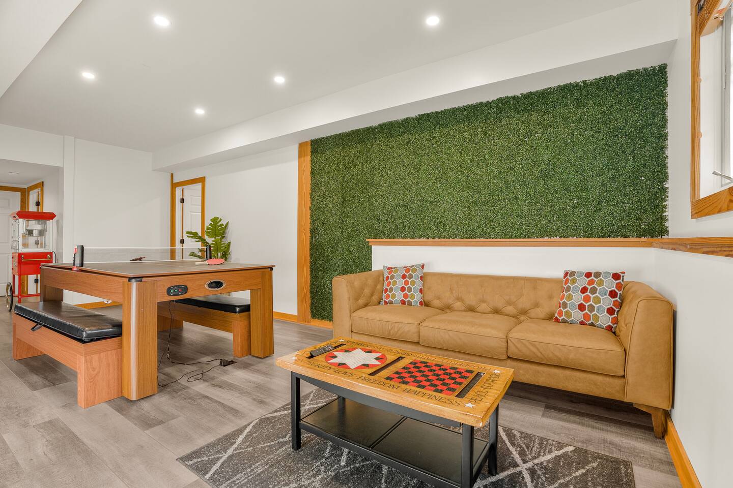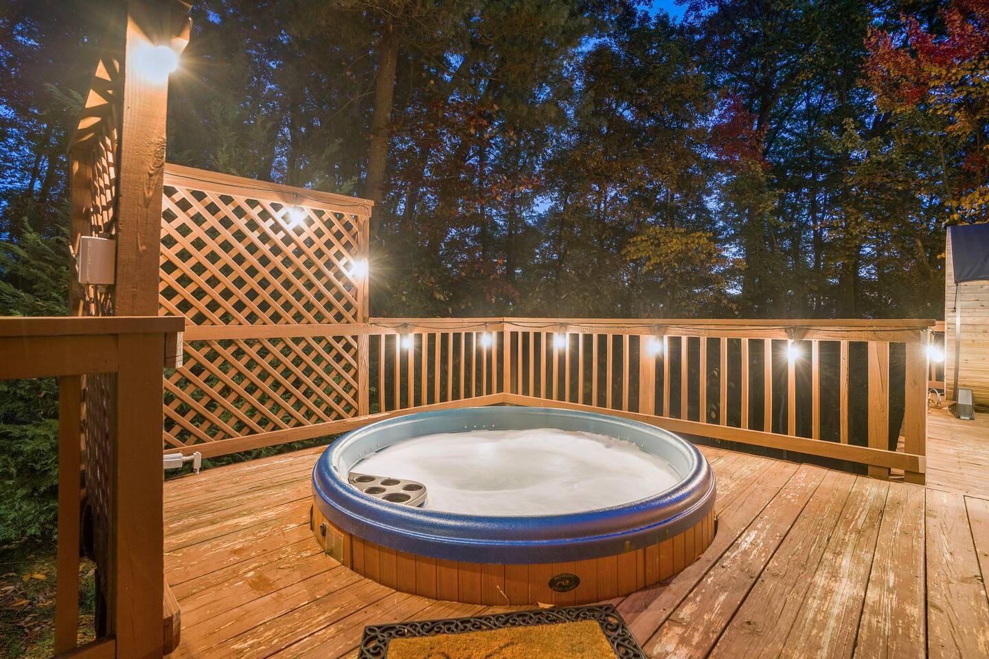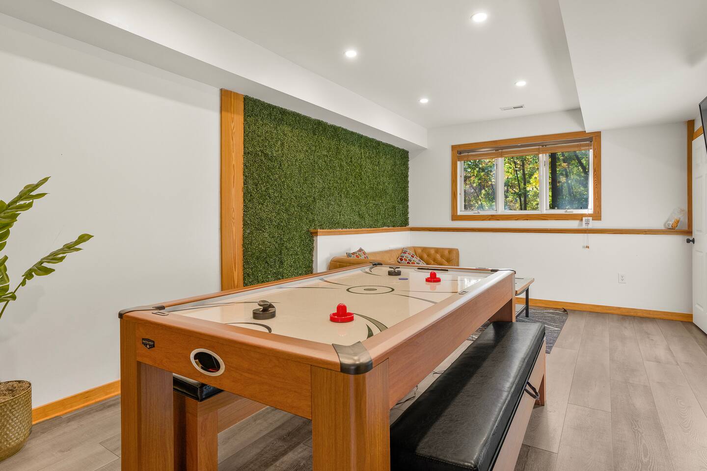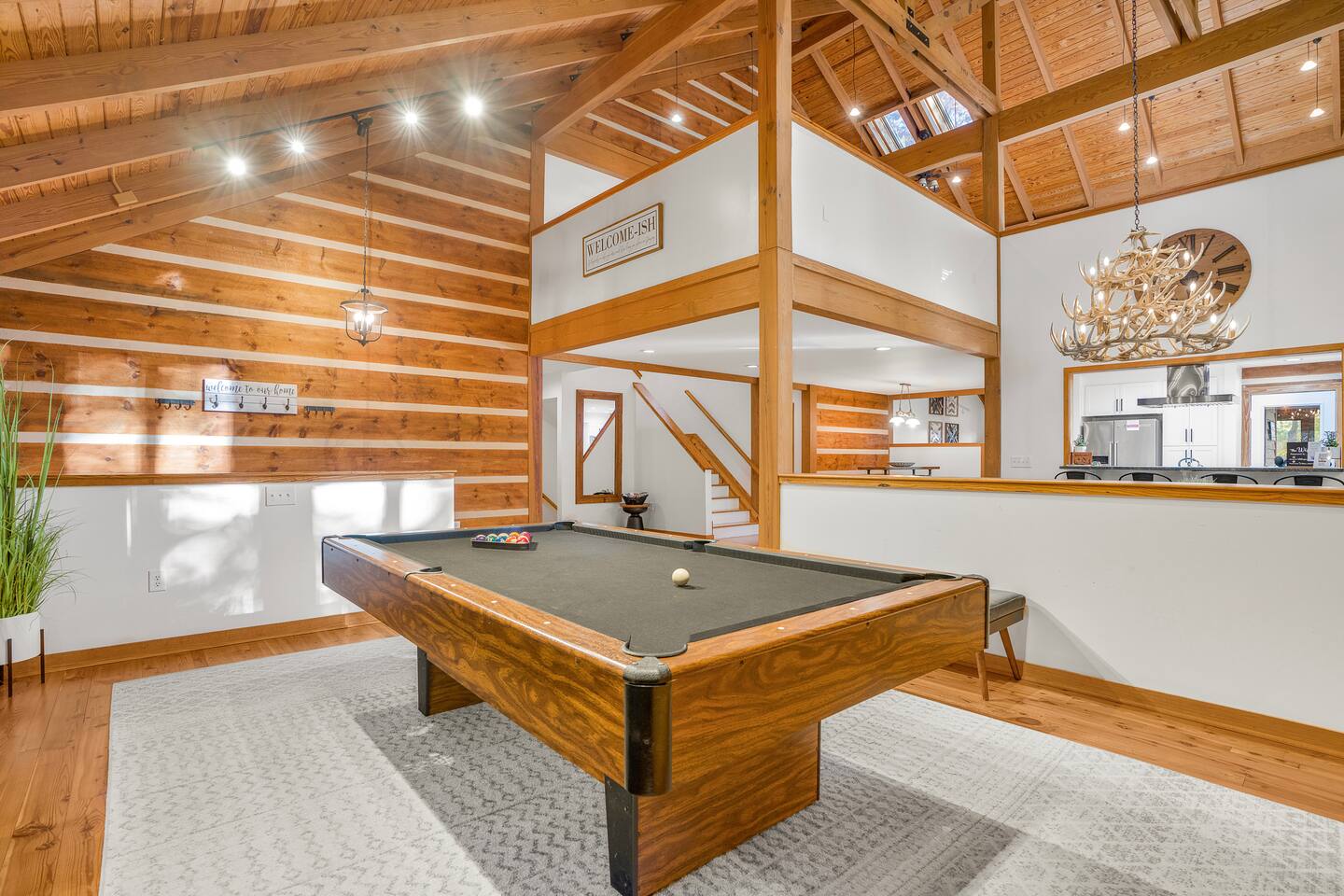 🏎️ Mins to all Massanutten Resort activities 💦 Hot Tub & Sauna 🎥Theater Room 🎱 Billiards Room 🏓 Game Room- Air Hockey, Ping Pong 🔥 Gas log Fireplace 🍔 Charcoal Grill ★ Amenity-rich outdoor space for endless fun 🛀🏻 Bath Spa ~ Soaking tub w Towel Warmer 💦🎿⛳️Community Amenities 💻 GIGABIT+ Hi-speed WiFi 🧑🍳Fully Equipped Kitchen 🍿 Popcorn machine with complimentary popcorn kits ☕️ Coffee & Tea Station 🪑Huge Deck Areas and Screened Patio 📺 Streaming TV’s in every room ‼️ Min Renter Age 25 🛣️ Distance to: 1 mi 》Massanutten Resort activities 12mi 》James Madison University and Historic Harrisonburg 12mi 》Shenandoah National Park 27mi 》World Famous Luray Caverns 40mi 》Charlottesville, VA POOL NOTICE: We offer owners access to an outdoor pool on the resort during your summer stay for a small fee(just $6 per person). The pool is open from Memorial Day weekend to Labor Day weekend. If interested please check into the recreation center on the left side behind the Campfire Grill. THE GATHERING PLACE ——————————————————————— 》Expansive great room combining kitchen and dining areas 》Fully equipped kitchen with eat-in dining table, featuring: 》Complete set of cookware, bakeware, and utensils 》Essential cooking oil, spices, and seasonings 》Complimentary premium coffee, tea, sugar, and creamer 》Large dining table comfortably seating 16 guests 》Breakfast Nook Table seating 6 guests 》Cozy ambiance with a gas fireplace 》Smart TV and SONOS Play RELAX ——————————————————————— 》Hot tub and Sauna 》Bath Spa ~ Soaking tub ~ towel warmer 》Huge Deck Area 》Screened-in for the times you want to stay indoor but still stay close to nature 》Year-round mountain views from this space 》Yoga/Reading/Meditation area ENTERTAINMENT & FUN ——————————————————————— 》9.2.4 Channel Surround Sound Home Theater with 120in Projector screen 》Billiards Room with 8ft pool table 》Extensive board game collection for endless entertainment 》PATIO/DECK 》Jumbo Connect4 》Corn hole set 》GAME ROOM 》Air Hockey 》Ping Pong 》Game coffee table with both Checkers and Chinese Checkers 》Yoga/Reading/Meditation area 》Smart TV with inbuilt Hulu and SONOS Play 》Toys for toddlers and babies SLEEPING ARRANGEMENTS ——————————————————————— ★ Main Level 》Master bedroom: King bed and en suite full bathroom with huge soaking tub, walk in rain-head shower, walk-in closet, 55" Smart TV 》Half Bathroom on main level ★ Upper Level 》King bedroom with attached full bathroom with tile shower/tub, closet, 55" Smart TV 》King bedroom with shared bathroom, closet, 55" Smart TV ★ Lower Level 》Queen bedroom with two queen beds with closet and with tile shower/tub, 50" Smart TV 》Queen bedroom with two full beds with closet and shared bathroom, 50" Smart TV ★ High-speed Wi-Fi ★ Keyless entry ★ EV Charging - 50A plug (BYO-charging cord/plug) ★ Entrance door, driveway, and rear woods area security cameras ★ Heating/Air Conditioning ★ Washer/Dryer ★ Private parking for up to 5 cars (additional parking for 3-4 vehicles available in front of the property) Other things to note: PARKING ——————————————————————— 》You can park two cars in garage which can be accessed from inside via laundry room. 》Driveway can also accommodate 3 cars with careful arrangement 》Easier Street Parking Available(3-4 cars) Note: **4WD still needed to reach the cabin in icy/snowy conditions** SECURITY ——————————————————————— For your safety and security, there are two cameras on the property. The discreet doorbell camera is positioned to monitor the main entryway. Cameras on the side of the garage monitor the driveway. None of the cameras face private areas like the hot tub or rear deck. All cameras are continuously recording. COMMUNITY RECREATION AMENITIES (Onsite/Nearby* Extra charges applicable) ——————————————————————— 》Skiing, snowboarding, ice skating and tubing in winter 》Canoe, Kayak, River Tubing and Fishing 》Indoor and outdoor waterparks for year-round fun 》Hiking, mountain biking, zip-lining, bicycle trails and horseback riding 》Two scenic 18-hole golf courses 》Mountain coaster rides and community pools 》Spa services, including massages and facials 》Family-friendly activities like video arcade, mini-golf, go-karts, and bumper cars NEARBY ATTRACTIONS ——————————————————————— 》Shenandoah National Park – Skyline drive, breathtaking overlooks, and wildlife, just 20 minutes away 》Luray Caverns – Explore the world famous Luray caverns just a short drive from the house 》George Washington National Forest – A haven for hikers, hunters, and nature lovers 》Shenandoah River – Perfect for kayaking, canoeing, and tubing 》Local Towns – Explore the charm of nearby Harrisonburg, Luray, and Elkton, with their boutique shops and dining 》Wineries & Breweries – Sample local flavors at CrossKeys Vineyards, Bluestone Vineyard, and Pale Fire Brewing (see complete guidebook for more) GUEST ACCESS Guests have access to the entire property except for the mechanical room and the unfinished storage space. Lastly, this property is located within an HOA that requires the community rules to be posted here, so here are those rules: WELCOME TO MASSANUTTEN! This home is in a private residential neighborhood and is part of the Massanutten Property Owners Association (MPOA), governed by its rules and regulations. There are rental homes in all MPOA neighborhoods, but people also live here. Your nearby neighbors may be full-time residents, including families with children, r